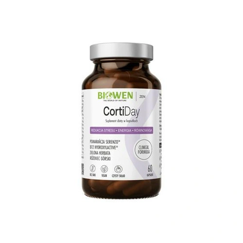 CortiDay Biowen to suplement diety stworzony z myślą o osobach, które chcą redukować stres i wspierać równowagę kortyzolu. Łączy w sobie ekstrakt z pomarańczy chińskiej Serenzo™, różeniec górski, zieloną herbatę, amlę Saberry®, a także witaminę B3, metylowaną i hydroksylową formę witaminy B12 oraz selen SeleniumSeLECT®. Synergia tych składników działa uspokajająco, a jednocześnie dodaje energii i poprawia koncentrację. To doskonały wybór dla osób zapracowanych, narażonych na przewlekły stres, rodziców w biegu oraz wszystkich, którzy chcą przejść przez dzień spokojniej i z większą energią.