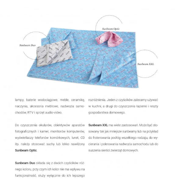 Sunbeam jest czyścikiem wyprodukowanym z syntetycznych mikrowłókien, o grubości kilku tysięcznych milimetra.